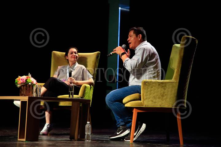 QUERÉTARO, QUERÉTARO, 10SEPTIEMBRE2023.- La escritora Fernanda Melchor en conversación con Julián Herbert, durante el el tercer día de actividades del Hay Festival Querétaro. FOTO: CÉSAR GÓMEZ/CUARTOSCURO.COM