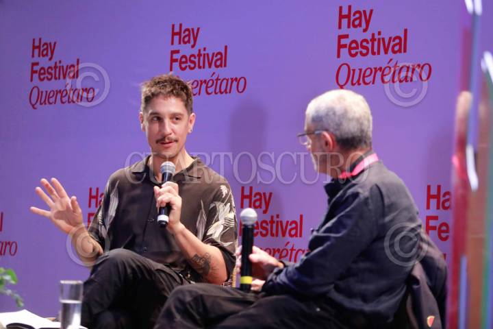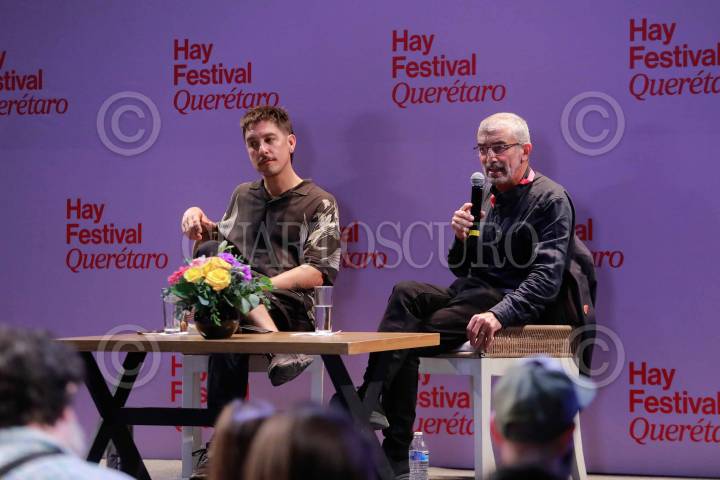 QUERÉTARO, QUERÉTARO, 06SEPTIEMBRE2024.- Los escritores Andrés Cota Hiriart y Naief Yehya en conversación sobre el libro “El planeta de los Hongos” durante el segundo día de actividades del Hay Festival Queretaro 2024. FOTO: CÉSAR GÓMEZ/CUARTOSCURO.COM