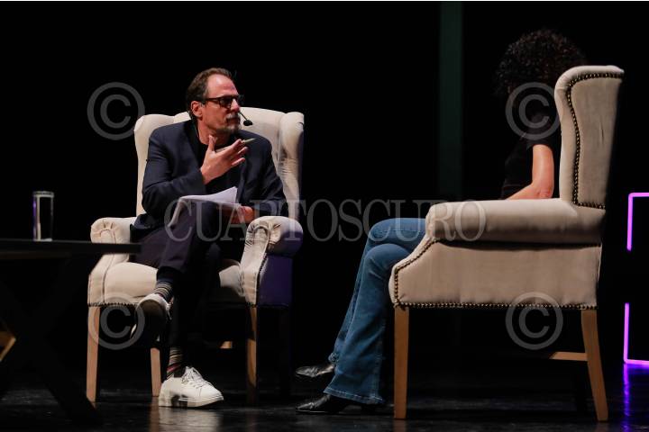 QUERÉTARO, QUERÉTARO, 08SEPTIEMBRE2024.- Javier Ramírez Gómez Chá en conversación vía remota con Collin Greenwood de la banda británica Radiohead, durante el cuarto día de actividades del Hay Festival Querétaro 2024. FOTO: CÉSAR GÓMEZ/CUARTOSCURO.COM
