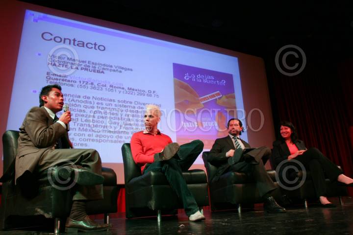 MÉXICO, D.F., 23SEPTIEMBRE2008.- Víctor Espíndola Villegas, director general de la Agencia Noticias ANODIS, Cristian Chávez, integrante del grupo musical RBD, Ricardo Hernández, encargado de los temas relacionados de VIH de la Comisión Nacional de Derechos Humanos y Patricia Campos, integrante de AIDS Foundation Healt CARE, durante la conferencia de prensa de la campaña "Mejor Hazte la Prueba" que alienta a los jovenes a realizarse la prueba del Sida, el encuentro con los medios de comunicación se realizó en el Centro Cultural Contempo. FOTO: MOISÉS PABLO/CUARTOSCURO.COM