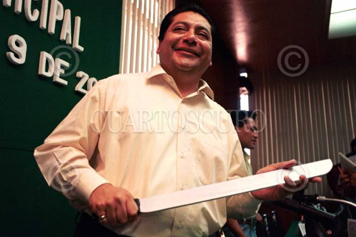 Héctor Bautista, presidente municipal de Nezahualcóyotl, al finalizar su 2º informe de gobierno mostró a los medios un machete de juguete, con el que dijo armarse para enfrentar a grupos de narcotraficantes que en recientes fechas le han acosado. FOTO: Juan Pablo Zamora/CUARTOSCURO.COM