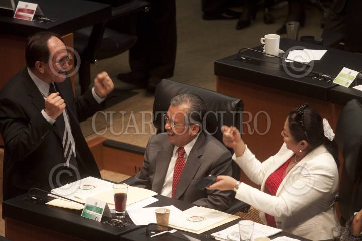 MÉXICO, D.F., 15MARZO2012.- El senador priista Heladio Ramírez López, es festejado por sus compañeros en la Cámara de Senadores. FOTO: MOISÉS PABLO /CUARTOSCURO.COM