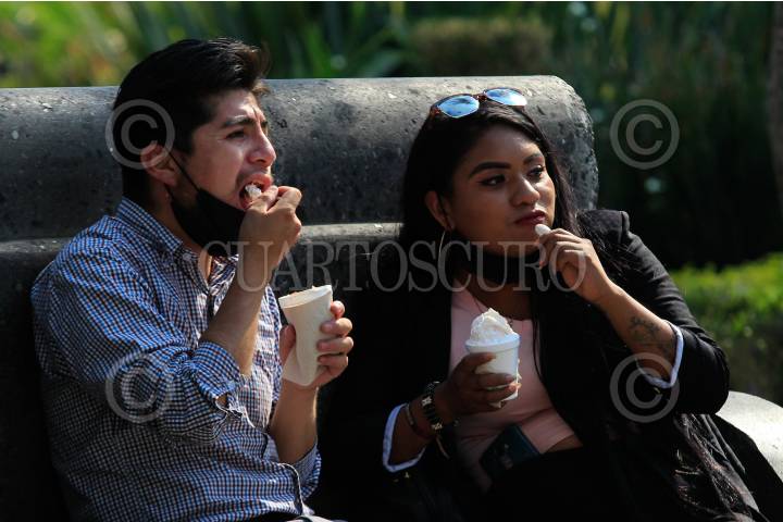 Una pareja disfruta de helados debido al calor, en la alcaldía Iztapalapa