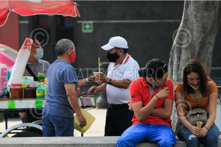 Una pareja disfruta de unos helados mientras un señor vende raspados en la explanada de la alcaldía Iztapalapa
