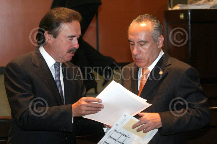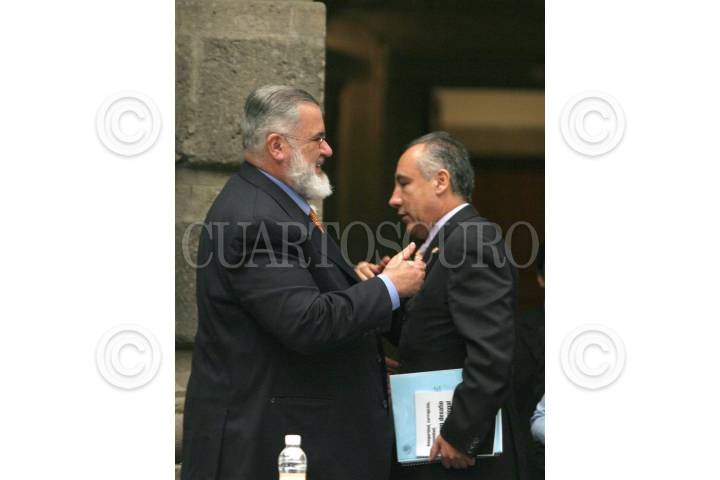 MEXICO, D.F., 21DICIEMBRE2005.- Emilio Gamboa Patrón, senador del PRI y Helidoro Díaz, diputado del PRI, durante la sesión de la Comisión Permanente en la Cámara de Diputados. FOTO: Moisés Pablo/CUARTOSCURO.COM