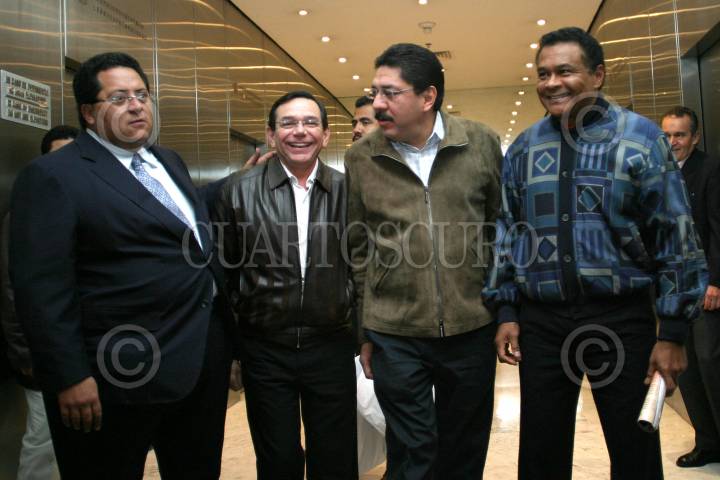 MEXICO, D.F. 22ENERO2004.- Manuel Andrade Díaz, gobernador de Tabasco, Carlos Hurtado, gobernador de Campeche, Ulices Ruíz, gobernador de Oaxaca y Joaquín Hendrick al termino de una reunión que sostuvieron en un conocido hotel de la ciudad de México. FOTO: Nelly Salas/CUARTOSCURO.COM
