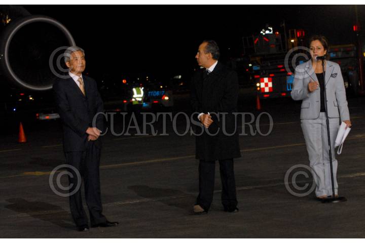 MÉXICO, D.F., 01MAYO2009.- Yin Hengmin, embajador de China en México; Felipe Calderón Hinojosa, presidente de México y Patricia Espinosa, secretaría de Relaciones Exteriores, la noche de ayer recibieron en el hangar presidencial el apoyo del gobierno chino que envió a México para enfrentar la emergencia sanitaria del virus de la influenza humana. La donación fue de cinco millones de dólares, un millón en efectivo y cuatro en insumos. FOTO: ALBERTO VERA/CUARTOSCURO.COM