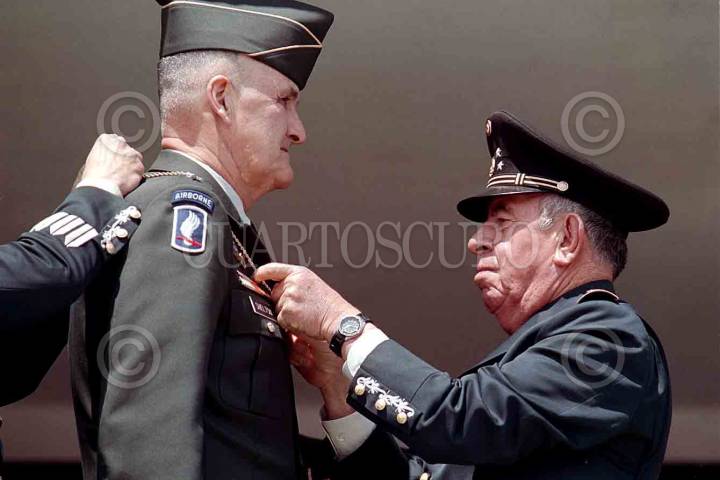 Henry Shelton, presidente de la junta de jefes de estado mayor de Estados Unidos, recibe una distinción militar de manos de Enrique Cervantes Aguirre, secretario de la Defensa Nacional.