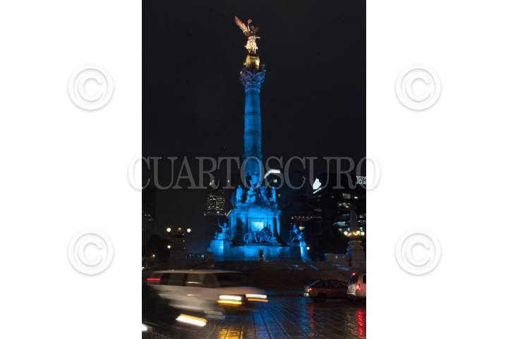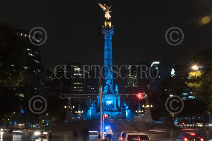MÉXICO, D.F., 28JULIO2014.- El Gobierno del Distrito Federal conmemoró el Día Mundial contra la Hepatitis iluminando de color azul claro el Ángel de la Independencia para promover el cuidado de la salud hepática. FOTO: IVÁN STEPHENS /CUARTOSCURO.COM