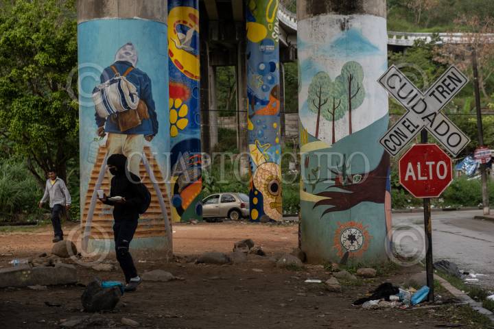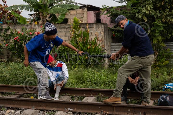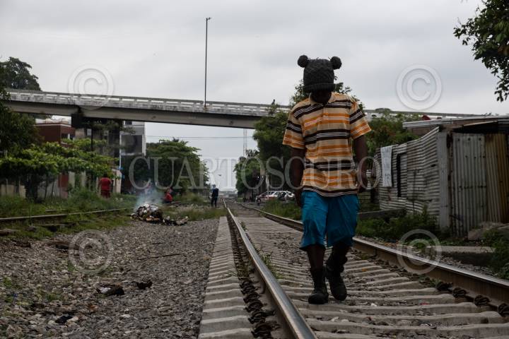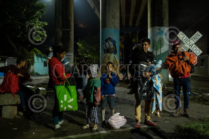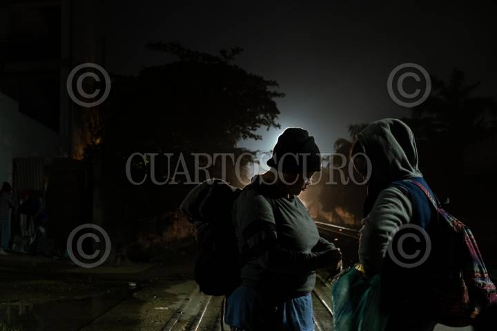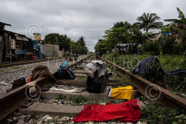 Migrantes hondureños esperan sobre las vías cercana a la Estación del municipio para tomar el tren y continuar su camino rumbo a Estados Unidos, objetivo que comparten familias que han sido victimas del cambio climático, desempleo y violencia.