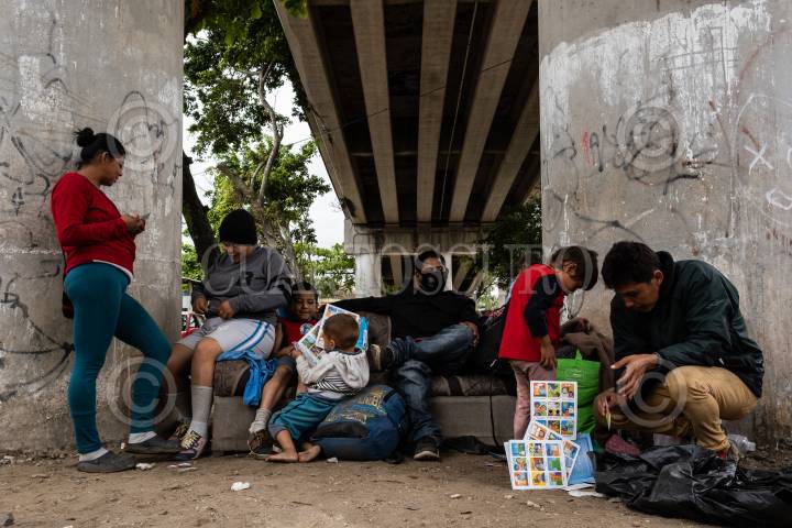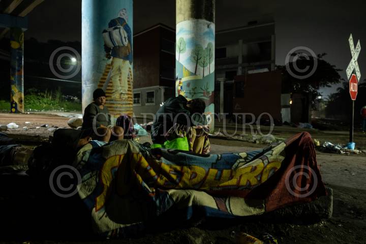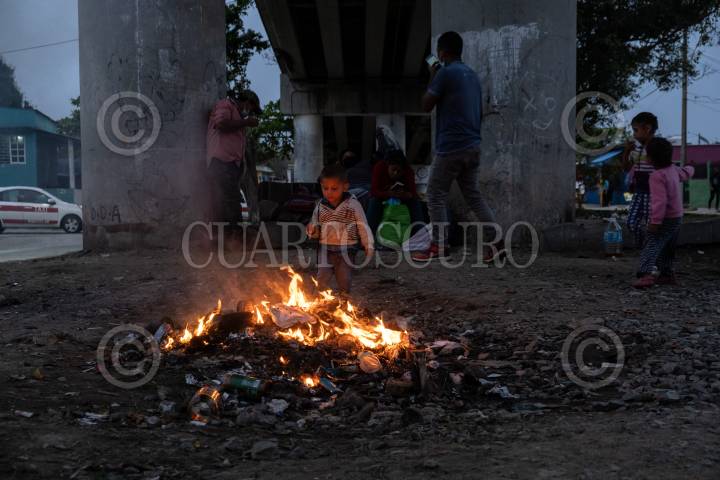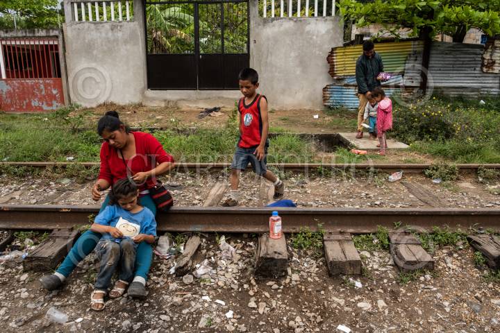 Familia migrante junto a las vías del tren en Coatzacoalcos, Veracruz.