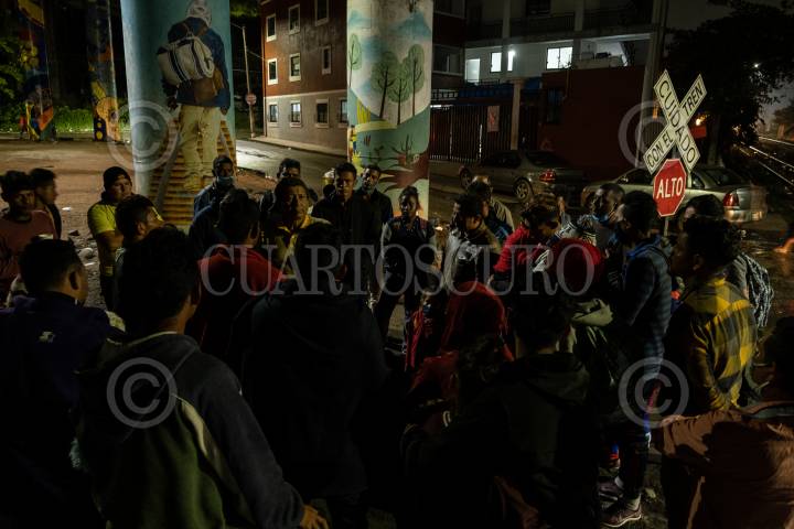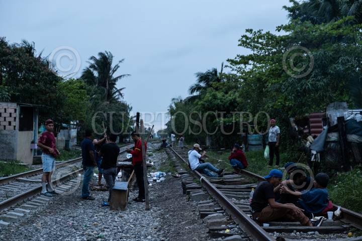 Reunión de migrantes hondureños junto a las vías del tren en Coatzacoalcos
