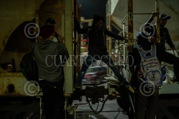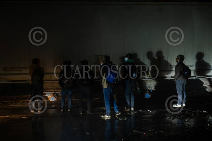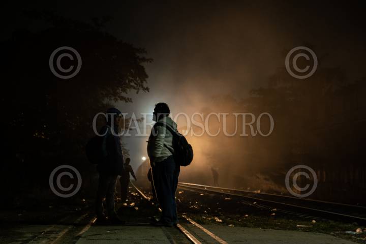 Migrantes hondureños iluminados por las luces de "La Bestia" en Coatzacoalcos.