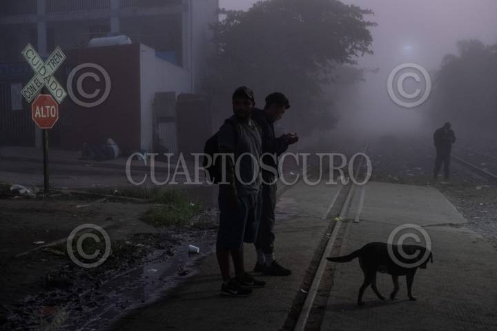 Migrantes hondureños esperan el mejor momento para montar el tren "La Bestia", en Coatzacoalcos, Veracruz.