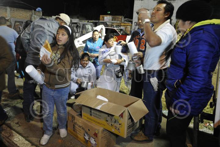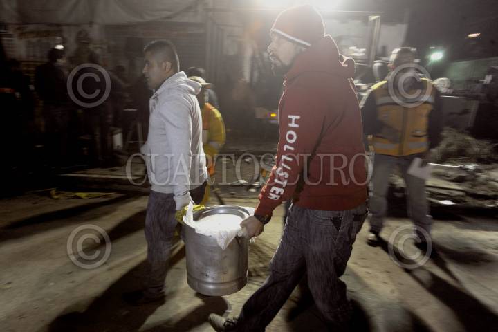 MÉXICO D. F., 30ENERO2015.- Vecinos de la colonia El Contadero y de Cuajimalpa Centro, arribaron en camionetas y a pie durante la madrugada, con café caliente, té, pan y agua, en la zona donde trabajan personal policiaco, rescatistas, bomberos, Protección Civil, entre tantos más. Para ofrecer algún alimento a estos trabajadores, que durante horas mantenían las labores de búsqueda de personas atrapadas en el derrumbe del Hospital Materno Infantil de Cuajimalpa. FOTO: LUIS CARBAYO /CUARTOSCURO.COM