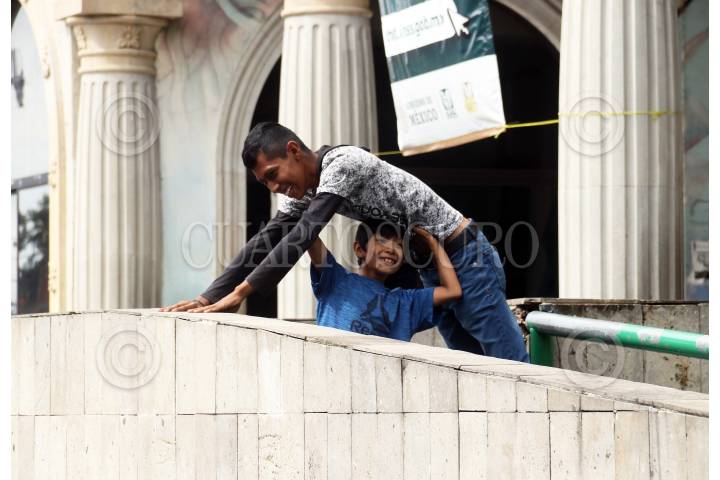 Una pareja de hermanos se divierten jugando en la rampa de la clínica de IMSS donde esperan que se les aplique la vacuna contra el Covid-19.