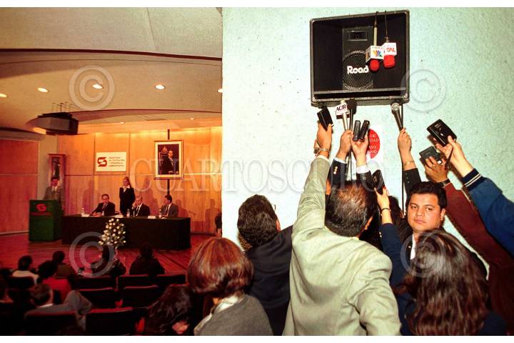 Un grupo de reporteros graban las voces de Herminio Blanco titular de la SECOFI y Arsenio Farell de la SECODAM que firmaron un convenio sobre el RENAVE. FOTO: Eduardo Loza/CUARTOSCURO.COM