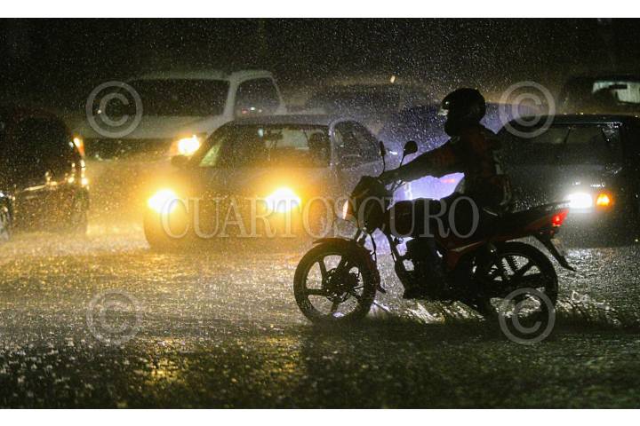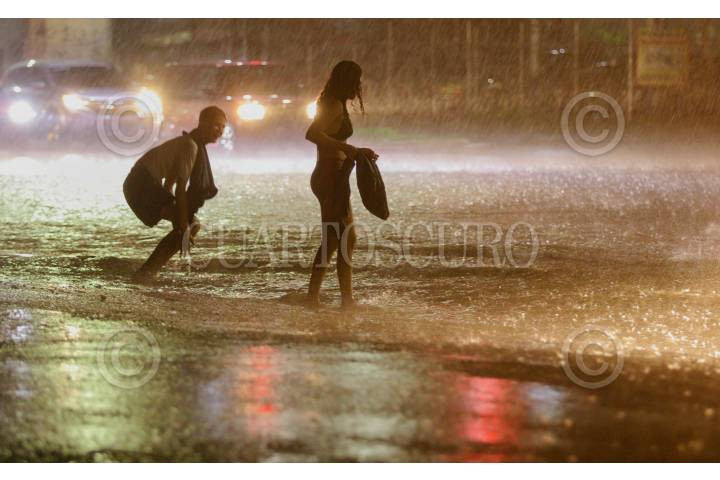 Un par de jóvenes cruzan el inundado bulevar Progreso, al norte de Hermosillo, descalzos para no perder el calzado con la corriente de las lluvias provocadas por la tormenta Nora.