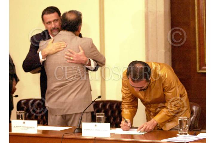 Carlos Abascal saluda a Agustín Rodríguez, del STUNAM mientras Francisco Hernández Juárez afina su discurso en la reunión de trabajadores con funcionarios del gobierno de la República. FOTO: Victoria Valtierra/CUARTOSCURO.COM