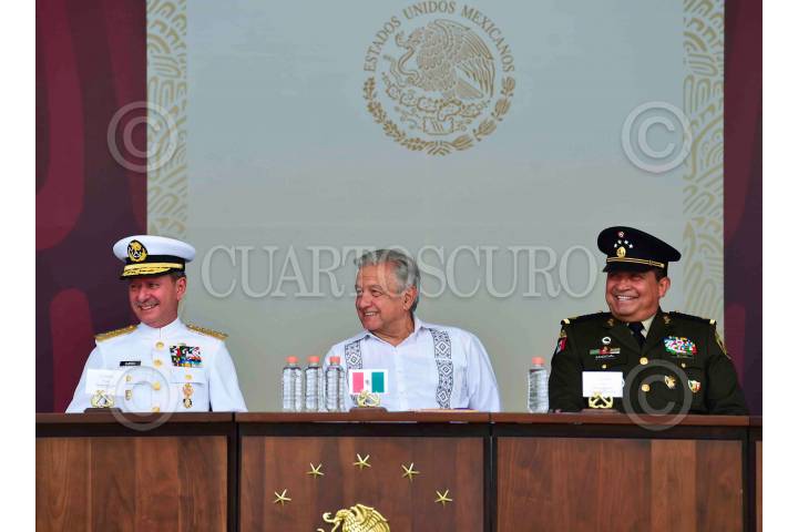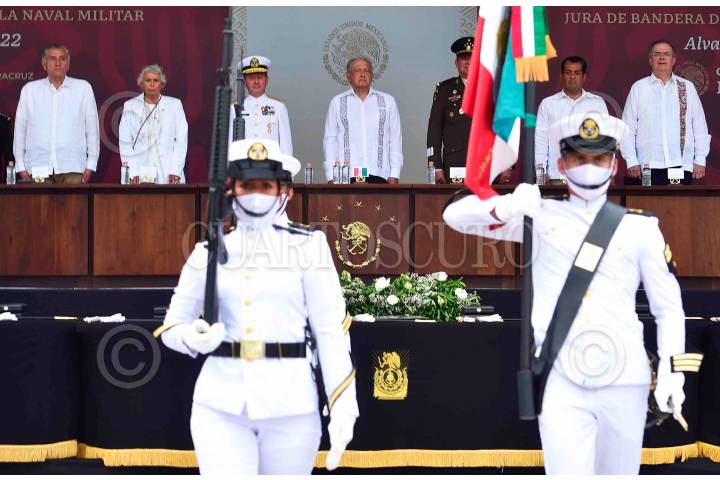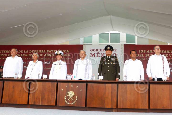 Adán Augusto, Olga Sánchez, Jose Rafael Ojeda Durán, Andrés Manuel López Obrador, Luis Cresencio Sandoval, Sergio Gutiérrez, y Marcelo Ebrard, durante el 108 Aniversario de la Defensa Patriótica de Veracruz (21 de abril de 1914) y Jura de Bandera de Cadetes de la Heroica Escuela Naval Militar.