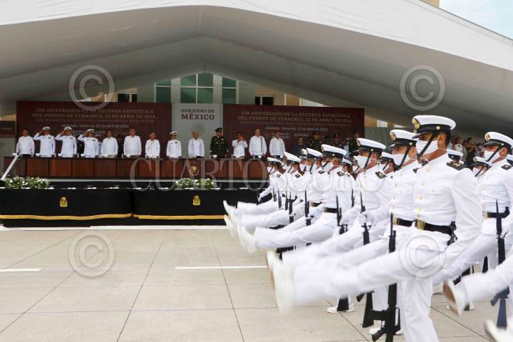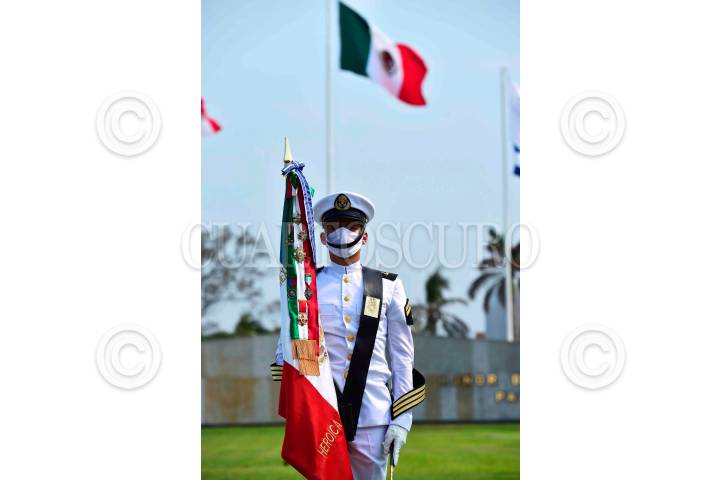 Cadetes durante el 108 Aniversario de la Defensa Patriótica de Veracruz (21 de abril de 1914) y Jura de Bandera de Cadetes de la Heroica Escuela Naval Militar.