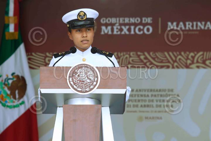 Una cadete ofrece su discurso durante el 108 Aniversario de la Defensa Patriótica de Veracruz (21 de abril de 1914) y Jura de Bandera de Cadetes de la Heroica Escuela Naval Militar.