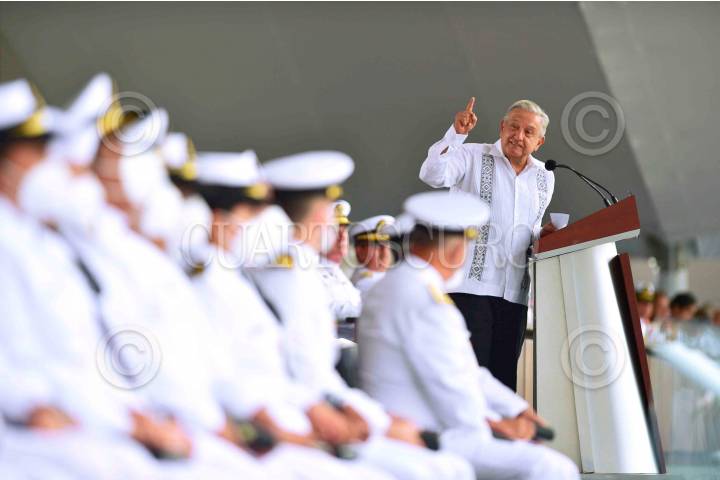 Andrés Manuel López Obrador, Presidente de México, durante el 108 Aniversario de la Defensa Patriótica de Veracruz (21 de abril de 1914) y Jura de Bandera de Cadetes de la Heroica Escuela Naval Militar.
