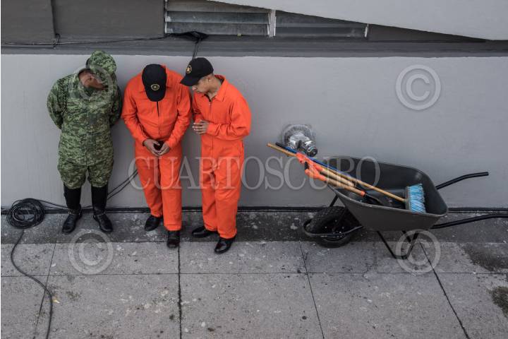 CIUDAD DE MÉXICO, 25AGOSTO2018.- Se realizó la ceremonia de Graduación de Alumnos del Heroico Colegio Militar. En su totalidad, 287 alumnos recibieron su título, certificado de estudios y patente del grado de Subteniente tras haber finalizado la Licenciatura en Administración Militar. En la imagen, elementos de limpieza, toman un ligero descanso mientras observan un celular. FOTO: MARIO JASSO /CUARTOSCURO.COM