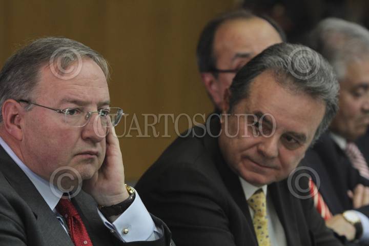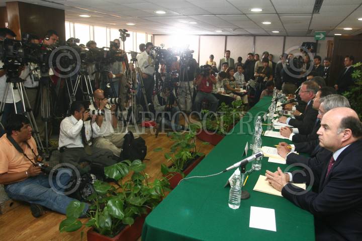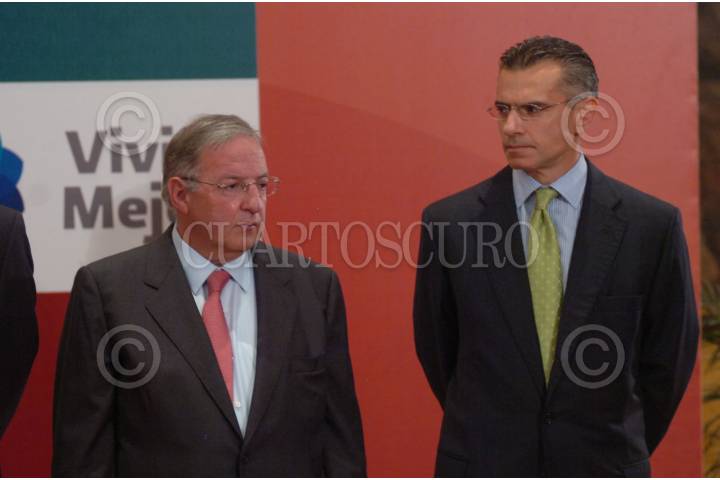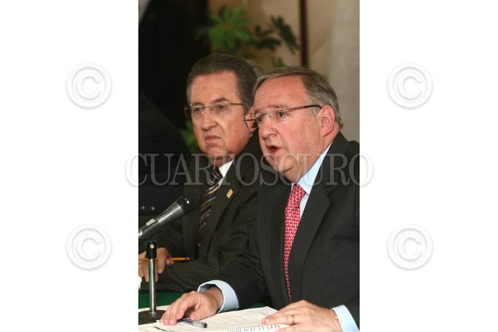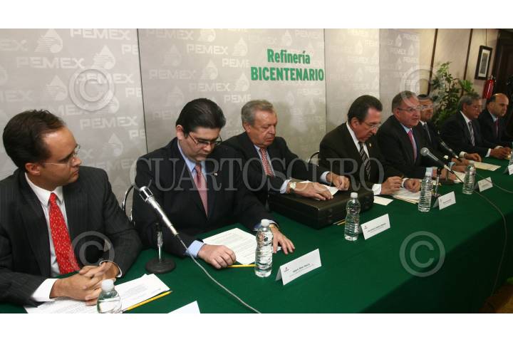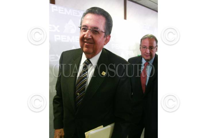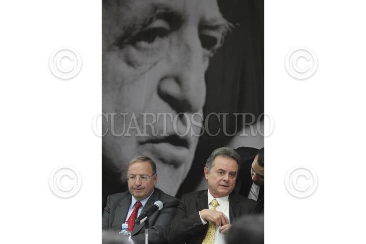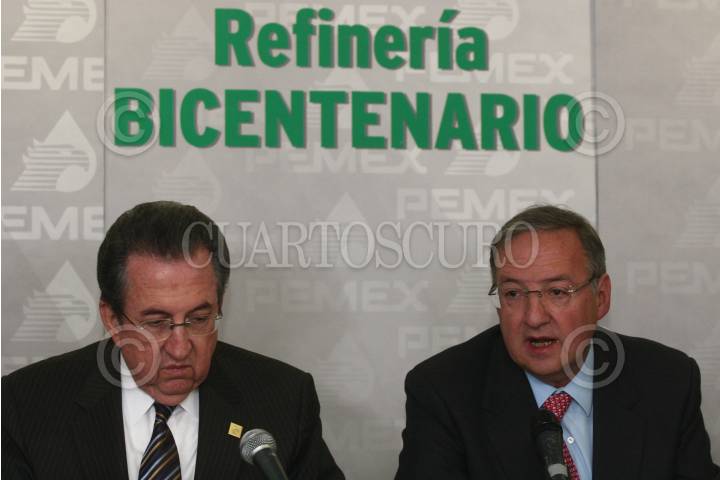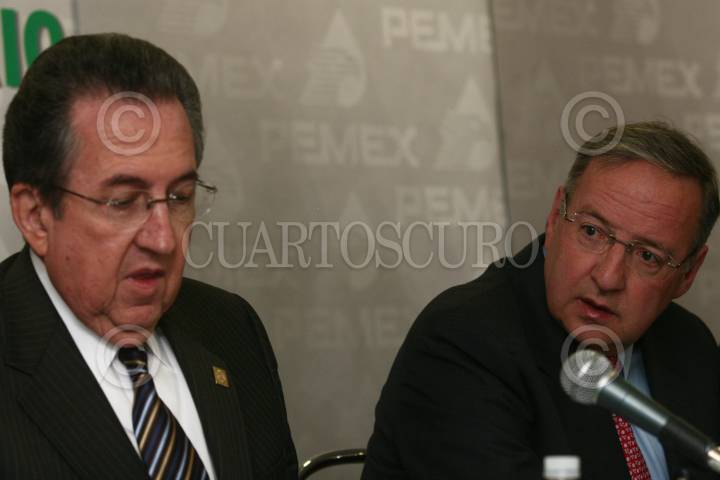 MÉXICO, D.F., 12AGOSTO2009.- Jesús Reyes Heroles, director de Pemex, acompañado del Secretario de la Reforma Agraria, Abelardo Escobar, ofrecieron una conferencia donde informaron que Tula será la sede de la nueva refinería, debido a que Hidalgo concluyó el proceso para que las tierras sean propiedad privada. FOTO: SAÚL LÓPEZ/CUARTOSCURO.COM