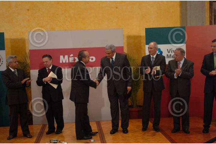 MÉXICO, D.F., 07SEPTIEMBRE2009.- Felipe Calderón Hinojosa, presidente de México, saluda a Juan José Suárez Coppel, nuevo director de Pemex, luego de que anunció la salida de Eduardo Medina Mora, procurador General de la República, Jesús Reyes Heroles, director de Pemex, y Alberto Cárdenas, titular de Sagarpa, quienes serán sustituidos por Juan Miguel Alcantara, Juan José Suárez Coppel y Francisco Javier Mayorga, respectivamente. FOTO: IVÁN MÉNDEZ/CUARTOSCURO.COM
