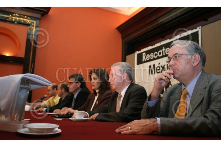 MEXICO, D.F. 03JUNIO2005.- José Antonio Ortega, Laura Elena Herrejón, Guillermo Velazquez Arzac y Guillermo Bustamantes integrantes de la organización Rescatemos México, durante la conferencia de prensa que ofrecieron con motivo del primer aniversario de la Gran Marcha Ciudadana. FOTO: Nelly Salas/CUARTOSCURO.COM