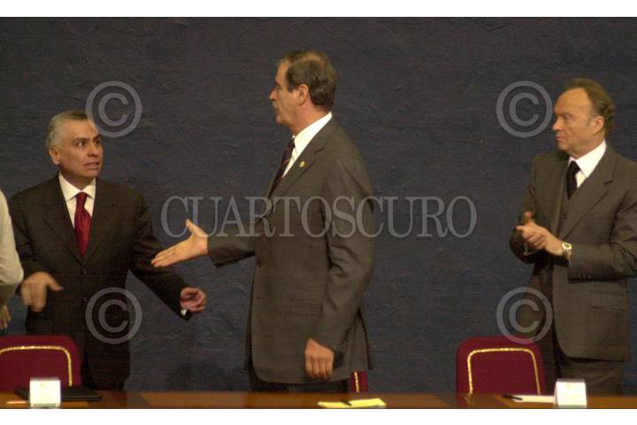 México, D.F. 16 FEBRERO 2004.- Rafael Macedo de la Concha, procurador general de la República, saluda a Vicente Fox Quesada, primer mandatario, luego de terminar con su intervención en la toma de protesta de la mesa directiva 2004-2006 de México unido contra la delincuencia, (a la derecha) Alejandro Hertz Manero, secretario de seguridad pública. FOTO: Sandra Perdomo/CUARTOSCURO.COM