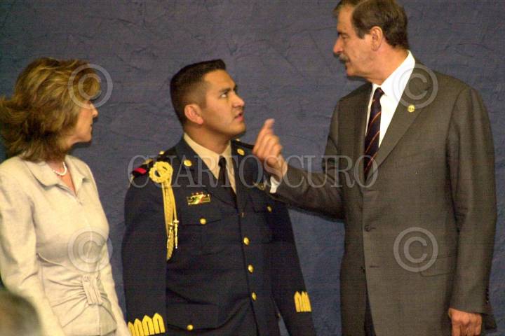 México, D.F. 16 FEBRERO 2004.- El presidente Vicente Fox da instrucciones a un asistente militar, durante la ceremonia de toma de protesta de la mesa directiva de México contra la delincuencia A.C., en el salón Adolfo López Mateos de los Pinos. FOTO: Sandra Perdomo/CUARTOSCURO.COM