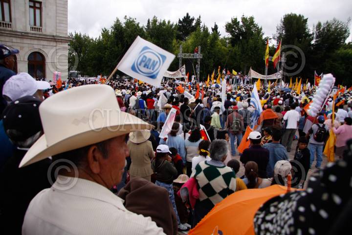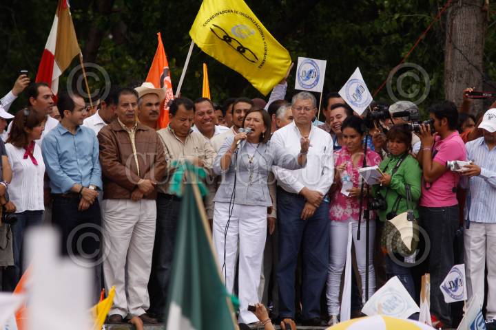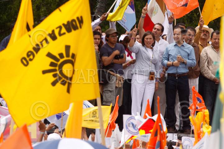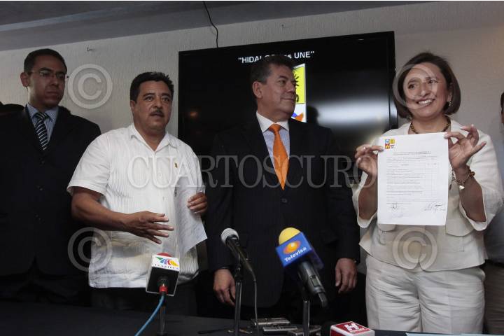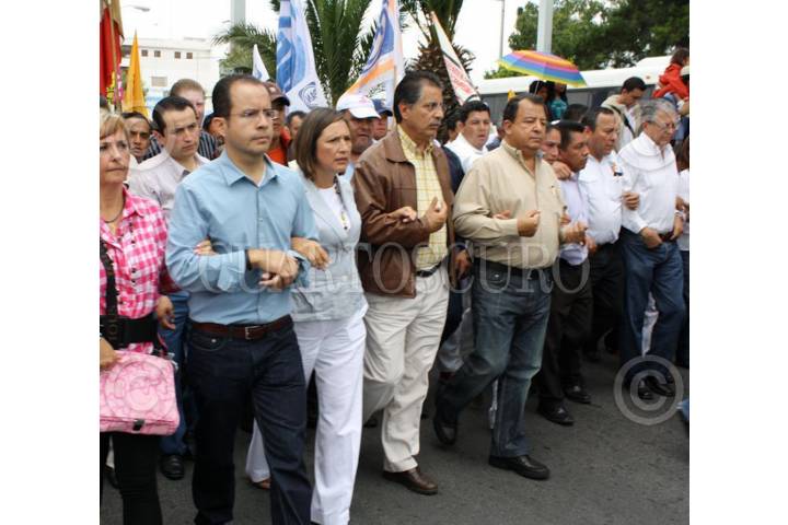 PaCHUCA, HIDALGO, 11JULIO2010.- El presidente nacional del PRD, Jesús Ortega Martínez, junto con César Nava, presidente de Acción Nacional; Luis Walton, dirigente de Convergencia; Manuel Camacho Solís, coordinador del DIA, así como con el diputado del PRD y coordinador de campaña, Jesús Zambrano, acompañaron a Xóchitl Galvez, candidata de la Coalición "Hidalgo nos une" para encabezar la marcha "Por la legalidad y la dignidad de los hidalguenses", que culminó con un mitin en la Plaza principal de Pachuca, Hidalgo. FOTO: MANUEL SALGADO/CUARTOSCURO.COM