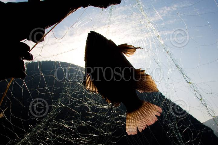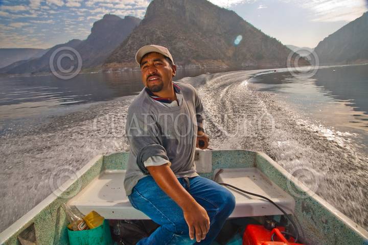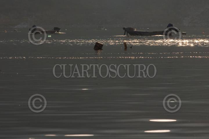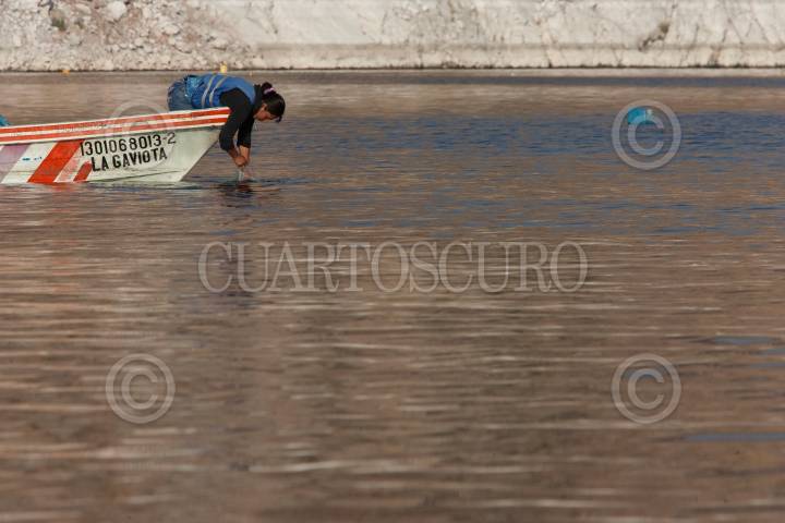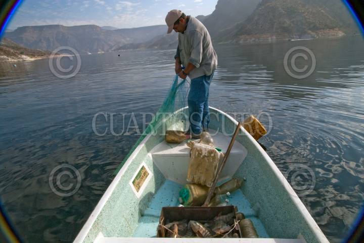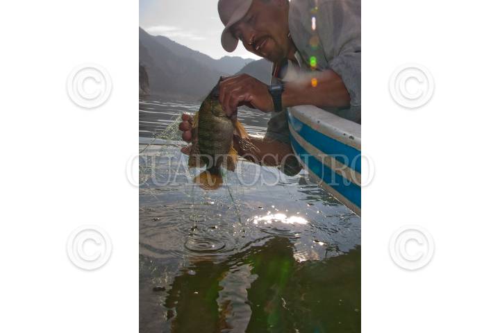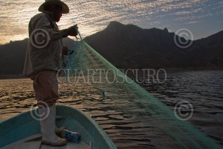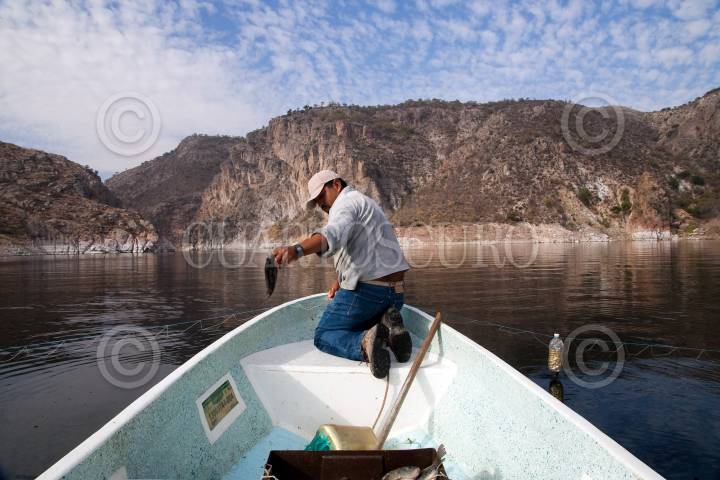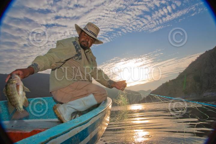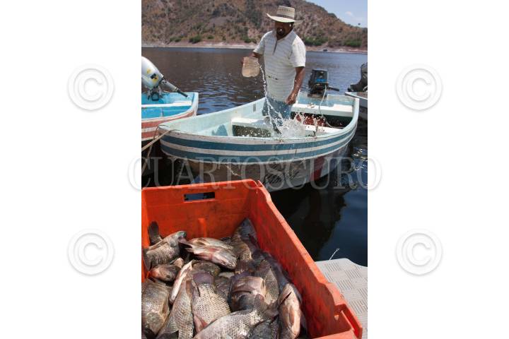 ZIMAPAN, HIDALGO, 08ABRIL2011.- Pescadores de la presa Zimapán ubicada en los límites de los estados de Hidalgo y Querétaro han sufrido en los últimos años un desbasto del producto, debido a la sobreexplotación de la pesca de mojarra en años anteriores. Para compensar el desbasto han sembrado el pez y en el año declaran hasta dos vedas para recuperar la cantidad de producto. Aunado a la escasez, ha disminuido la demanda debido a la publicación de algunos estudios del agua y vísceras del pez en la que se ha detectado concentraciones de plomo y arsénico derivados de la hidroeléctrica que se encuentra también ubicada en la zona. Sin embargo los pescadores (organizados en cooperativas) afirman tener estudios que confirman la sanidad de los peces. Debido a la baja economía algunos pescadores han decidido emigrar a EU, dejando a las mujeres de la comunidad la labor de la pesca. La comercialización del producto se da en Hidalgo, Querétaro y DF principalmente. FOTO: DEMIAN CHAVEZ/CUARTOSCURO.COM