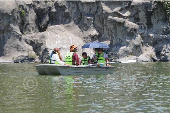 Una familia utiliza una lancha en el Lago de Chapultepec mientras se protegen del sol.