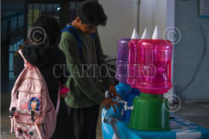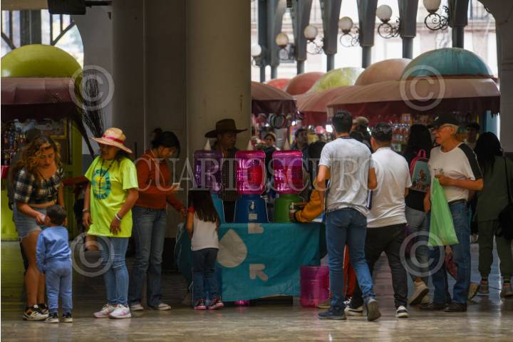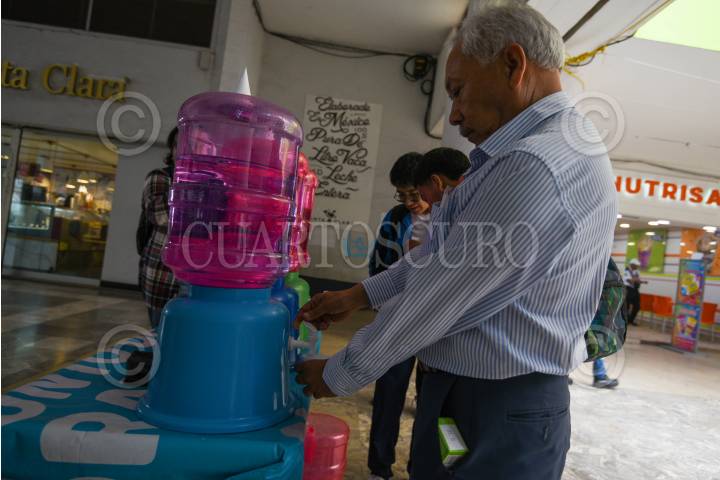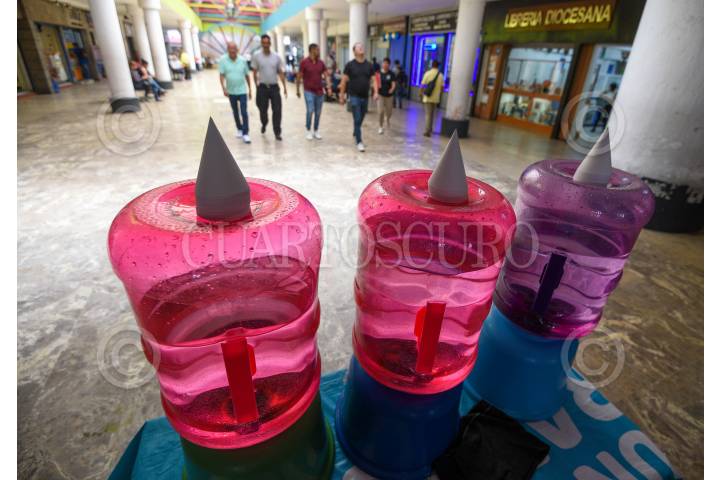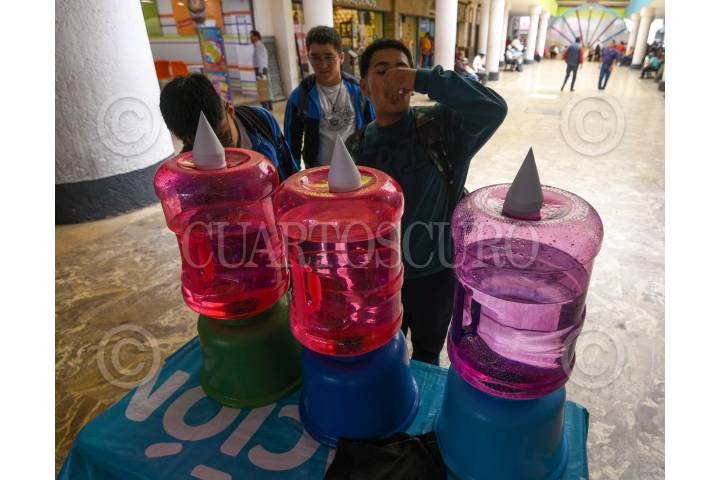 TOLUCA, ESTADO DE MÉXICO, 29MAYO2024.- Ante las altas temperaturas que se han presentado en el Valle de Toluca fueron instalados dispensadores de agua en la Concha Acústica en los Portales de Toluca para que la población pueda hidratarse cuando pasa por esta zona. FOTO: CRISANTA ESPINOSA AGUILAR /CUARTOSCURO.COM