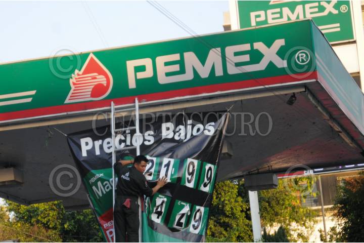CIUDAD DE MÉXICO, 15ENERO2024. - Un trabajador de una gasolinera de Pemex coloca los precios en los que se encuentra la magna en esa estación, el cual es de 21.99 pesos el litro. FOTO: DANIEL AUGUSTO /CUARTOSCURO.COM