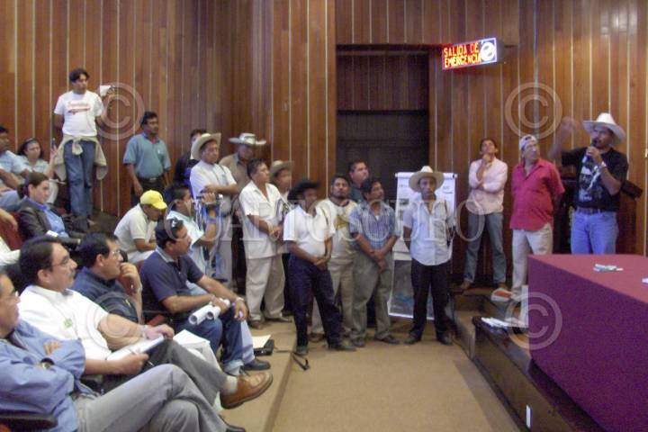 CHILPANCINGO,GUERRERO.-11OCTUBRE2005.- Funcionarios de la CFE que llevaban a cabo la mesa redonda "Proyecto Hidroeléctrico La Parota" en el auditorio de rectoría de la Universidad Autónoma de Guerrero (UAG) en Chilpancingo, observan a comuneros opositores a dicho proyecto encabezados por su vocero Marco Antonio Suastegui Muñoz (primero de izquierda a derecha) , donde hicieron uso de la palabra para dar a conocer a los asistentes el motivo de estar en contra de dicho proyecto, que les hará perder su patrimonio. Foto: Oscar Alvarado/CUARTOSCURO.COM