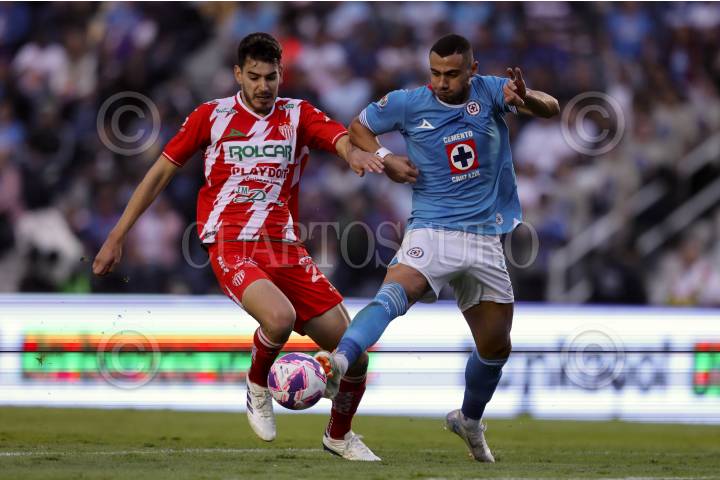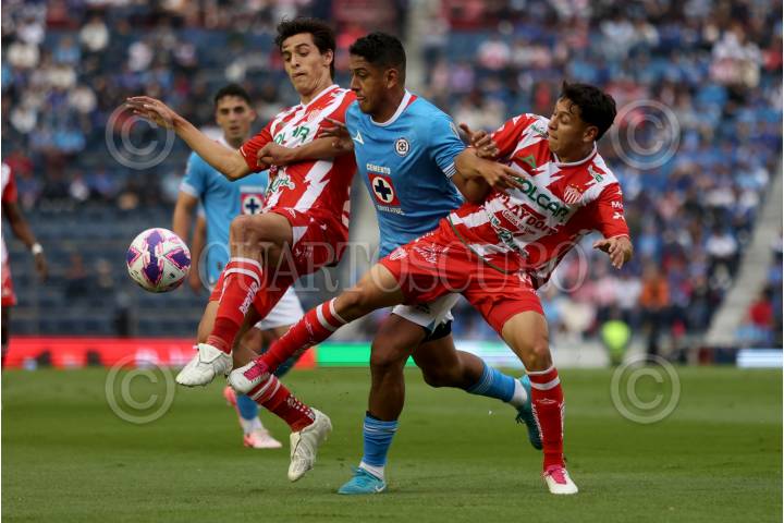 CIUDAD DE MÉXICO, 05OCTUBRE2024. Fernando Arce y Diego Gómez de los Hidrorayos marcan al jugador de la Máquina Celeste, Luis Romo durante el partido de fútbol Cruz Azul vs Necaxa correspondiente a la jornada 11 del Torneo Apertura 2024 de Liga BBVA MX, en el Estadio Ciudad de los Deportes. FOTO: EDGAR NEGRETE LIRA/CUARTOSCURO.COM