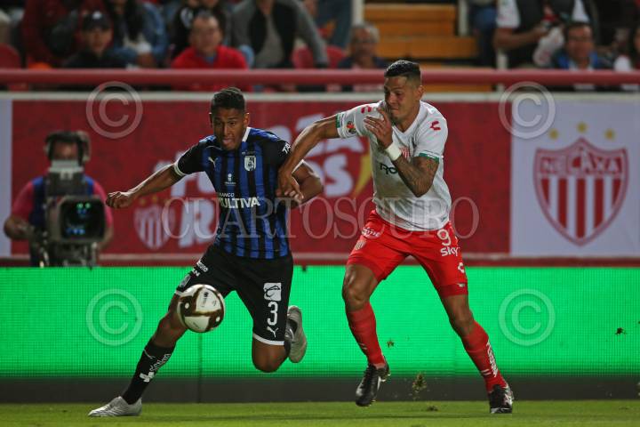 AGUASCALIENTES, AGUASCALIENTES, 27NOVIEMBRE2019.- Kevin Mercado jugador de Necaxa disputa un balón con el contrario George Corral de Querétaro, esto en partido correspondiente a los Cuartos de Final del Torneo Apertura 2019 de la Liga MX, en donde se enfrentan los Hidrorayos del Necaxa frente a los Gallos Blancos de Querétaro, en partido que se lleva a cabo en el Estadio Victoria, el marcador al momento es de 2-0 a favor del equipo de casa. FOTO: FERNANDO CARRANZA GARCIA / CUARTOSCURO.COM
