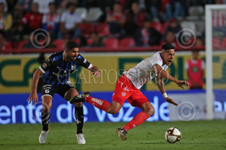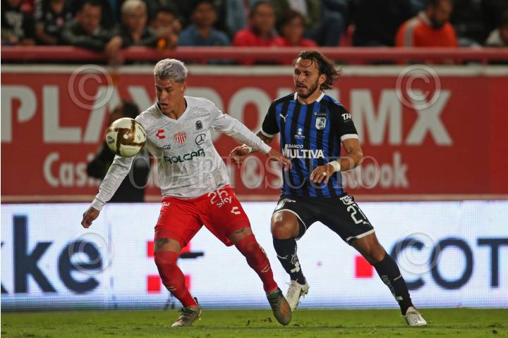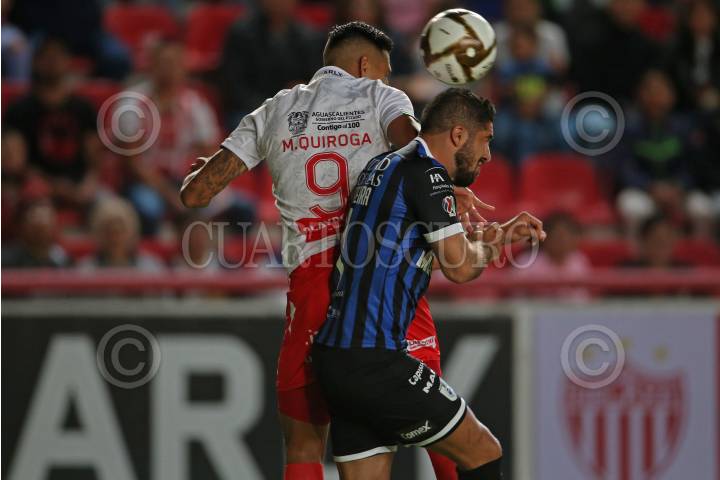 AGUASCALIENTES, AGUASCALIENTES, 27NOVIEMBRE2019.- Mauro Quiroga jugador de Necaxa disputa un balón con el contrario Luis Romo de Querétaro, esto en partido correspondiente a los Cuartos de Final del Torneo Apertura 2019 de la Liga MX, en donde se enfrentan los Hidrorayos del Necaxa frente a los Gallos Blancos de Querétaro, en partido que se lleva a cabo en el Estadio Victoria, el marcador al momento es de 0-0. FOTO: FERNANDO CARRANZA GARCIA / CUARTOSCURO.COM