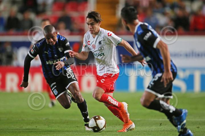 AGUASCALIENTES, AGUASCALIENTES, 27NOVIEMBRE2019.- Mauro Quiroga jugador de Necaxa disputa un balón con el contrario Jair Pereira de Querétaro, esto en partido correspondiente a los Cuartos de Final del Torneo Apertura 2019 de la Liga MX, en donde se enfrentan los Hidrorayos del Necaxa frente a los Gallos Blancos de Querétaro, en partido que se lleva a cabo en el Estadio Victoria, el marcador al momento es de 2-0 a favor del equipo de casa. FOTO: FERNANDO CARRANZA GARCIA / CUARTOSCURO.COM