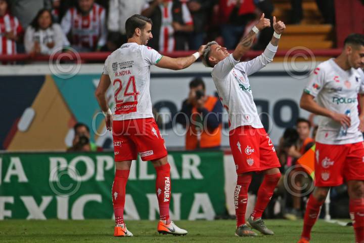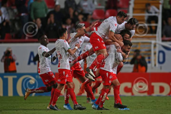 AGUASCALIENTES, AGUASCALIENTES, 27NOVIEMBRE2019.- Luis Gallegos jugador de Necaxa celebra con sus compañeros su anotación, esto en partido correspondiente a los Cuartos de Final del Torneo Apertura 2019 de la Liga MX, en donde se enfrentan los Hidrorayos del Necaxa frente a los Gallos Blancos de Querétaro, en partido que se lleva a cabo en el Estadio Victoria, el marcador al final es de 2-0 a favor del equipo de casa. FOTO: FERNANDO CARRANZA GARCIA / CUARTOSCURO.COM
