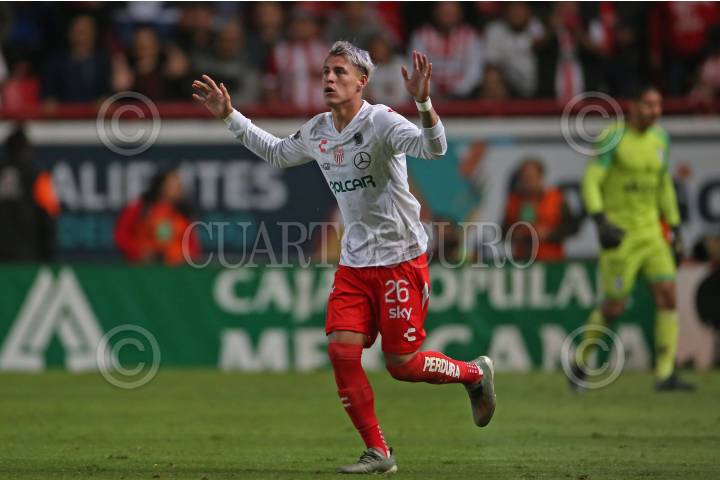 AGUASCALIENTES, AGUASCALIENTES, 27NOVIEMBRE2019.- Cristian Calderón jugador de Necaxa celebra su anotación, esto en partido correspondiente a los Cuartos de Final del Torneo Apertura 2019 de la Liga MX, en donde se enfrentan los Hidrorayos del Necaxa frente a los Gallos Blancos de Querétaro, en partido que se lleva a cabo en el Estadio Victoria, el marcador al momento es de 1-0 a favor del equipo de casa. FOTO: FERNANDO CARRANZA GARCIA / CUARTOSCURO.COM