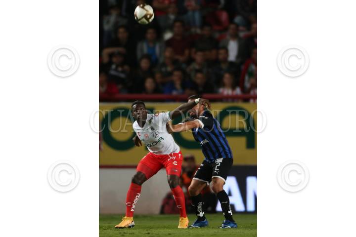 AGUASCALIENTES, AGUASCALIENTES, 27NOVIEMBRE2019.- Mauro Quiroga jugador de Necaxa disputa un balón con el contrario Jair Pereira de Querétaro, esto en partido correspondiente a los Cuartos de Final del Torneo Apertura 2019 de la Liga MX, en donde se enfrentan los Hidrorayos del Necaxa frente a los Gallos Blancos de Querétaro, en partido que se lleva a cabo en el Estadio Victoria, el marcador al momento es de 0-0. FOTO: FERNANDO CARRANZA GARCIA / CUARTOSCURO.COM