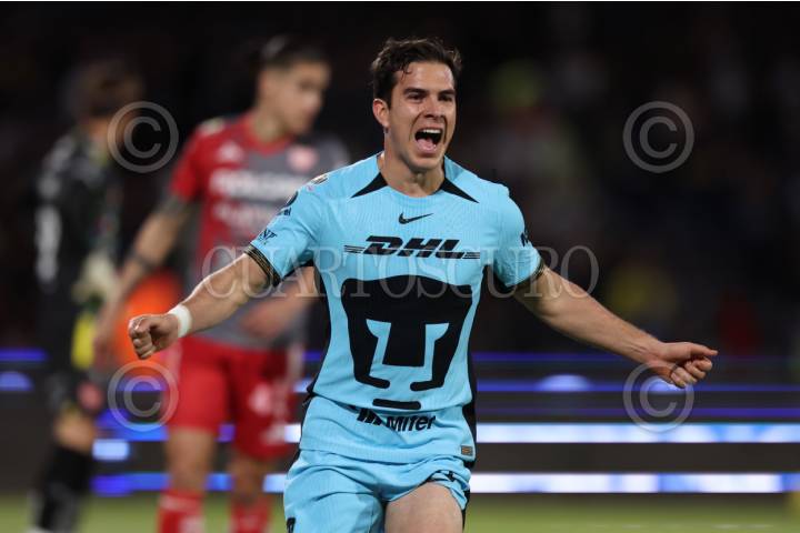 CIUDAD DE MÉXICO, 31ENERO2024. Festejo del jugador Jesús Rivas tras su anotación en el partido de fútbol Pumas vs Necaxa correspondiente a la jornada 4 del Torneo Clausura 2024 de Liga BBVA MX, en el Estadio Olímpico Universitario. FOTO: EDGAR NEGRETE LIRA/CUARTOSCURO.COM