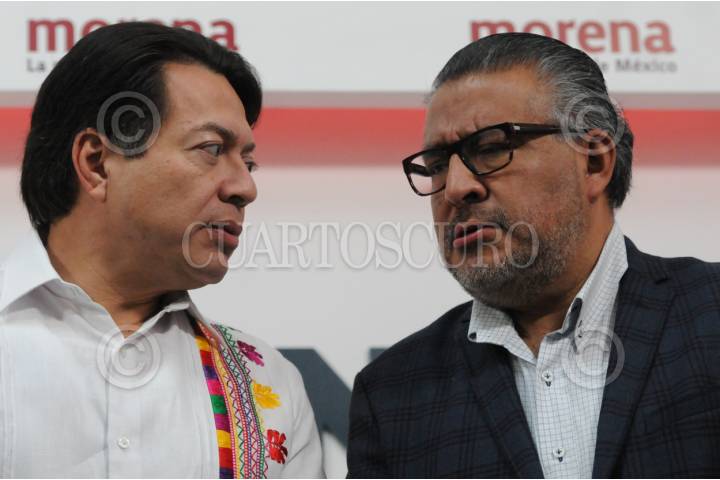 Mario Delgado y Horacio Duarte dialogan durante la conferencia.