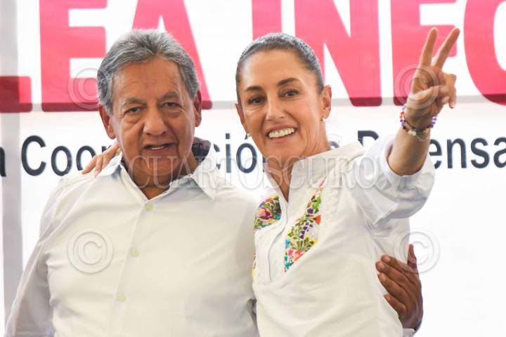Higinio Martínez, senador con licencia de Morena, junto a Claudia Sheinbaum, aspirante a coordinadora nacional de los comités de defensa de la Cuarta Transformación, durante la asamblea informativa realizada en el Deportivo de Santa Cruz Acatlán.