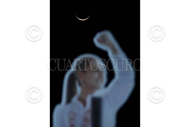 AMECAMECA, ESTADO DE MÉXICO, 10ABRIL2024.- La luna en cuarto creciente se observa previo al arribo de Claudia Sheinbaum, candidata a la presidencia de la República por la coalición "Sigamos Haciendo Historia" (Morena-PT-PVEM), para encabezar un mitin con simpatizantes en el zócalo del municipio mexiquense de Amecameca. FOTO: GALO CAÑAS/CUARTOSCURO.COM